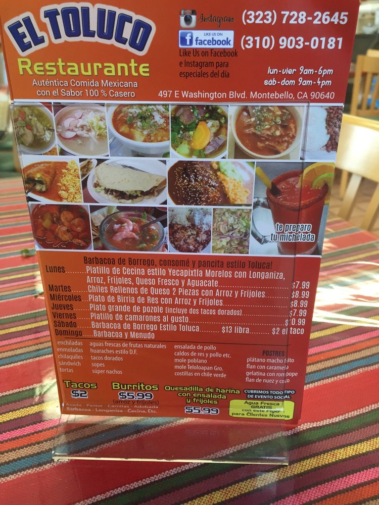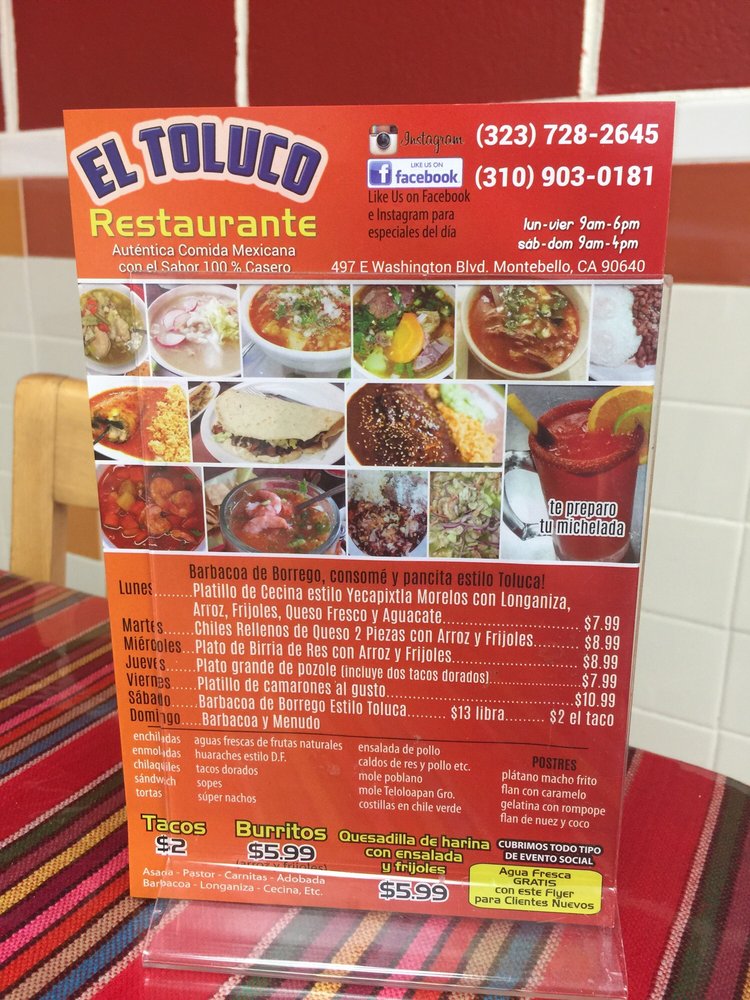 Introducing the menu at Toluco's Restaurant, a cozy Mexican eatery in Montebello, CA, known for its authentic and flavorful dishes. Customers rave about the pozole, tacos, chilaquiles de mole, and red chilaquiles. The house-made horchata and cafe de olla are must-tries for a true taste of Mexico. With a welcoming and family-owned ambiance, Toluco's offers a diverse menu with many vegetarian options, perfect for breakfast, brunch, or lunch. The attentive staff and colorful decor add to the dining experience, making it feel like home. Don't miss the generous portions, like the huge kids' cheese quesadilla, carne asada burrito, and complementary fresh chips with salsa. Despite some service hiccups, the overall dining experience at Toluco's is highly recommended.